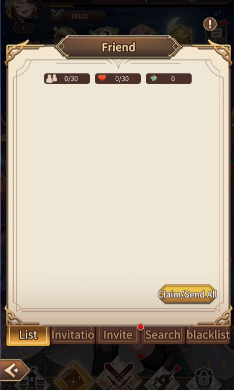 The Friends menu can be found on the top-right corner in the "quest" drop-down menu. In the friends menu you can look-up people, see your black list, invite others to be your friends and use the invitation codes you get from others.