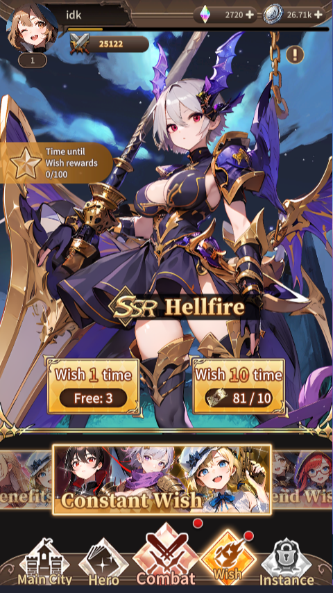 The Wish menu is the place where you can obtain fragments for your heroes. There are permanent draws and event/time-limited ones. If you press on the exclamation mark on the right, you can find the probabilities for the draws.