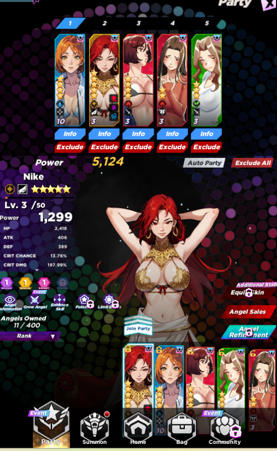 You can see your girls and create your team from the "Party" menu. You can any angel to see their information and level them and select their skin.