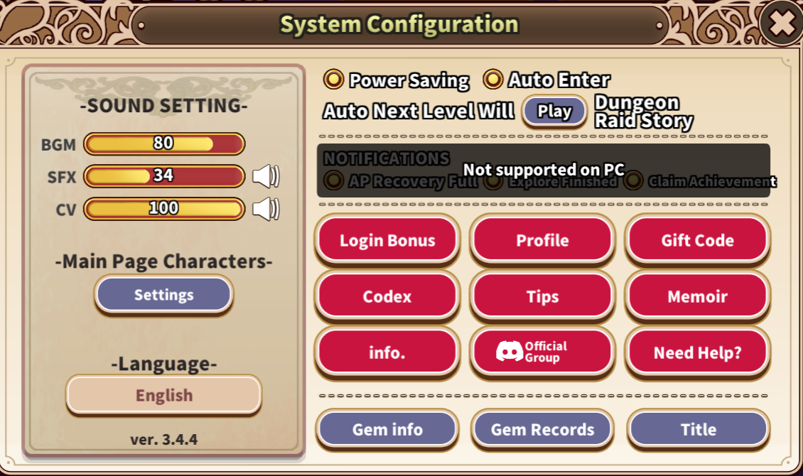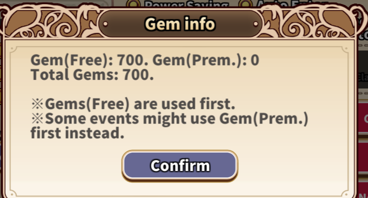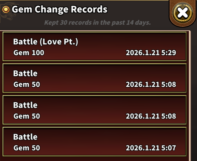 π Gem Info and history: Allows you to view a history of your Gem (premium currency) acquisitions and expenditures to help manage your gacha spending.