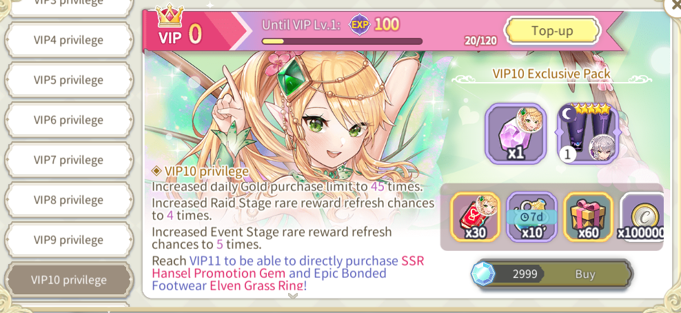 The game has a VIP system with 15 levels and each level gives more and more benefits and bonuses (such as daily stamine limit, daily gold purchase limit, accessories, promotion gems and much more).