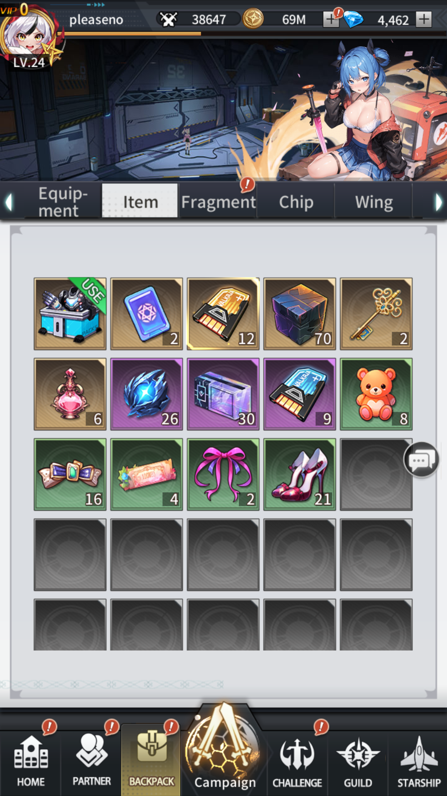 The backpack menu is where you can find pretty much all the items you obtain in game, items for pulls, for leveling up girl affection, equipment, girl shards, etc.