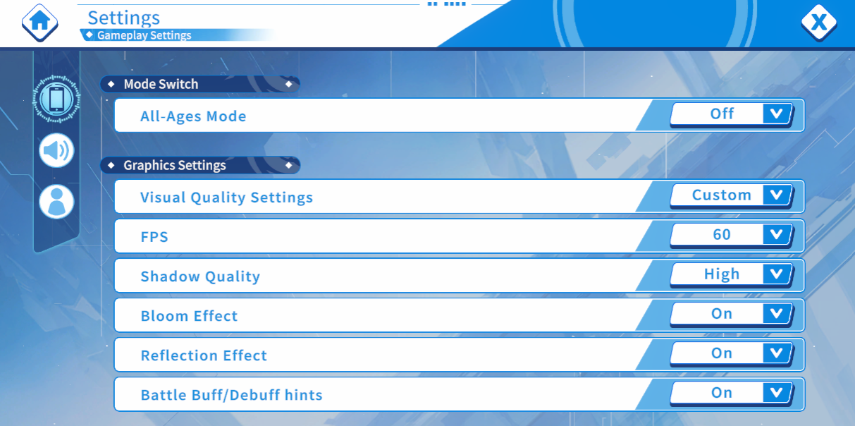 Here you can find multiple audio and graphic settings, including language change setting and a safe for work mode.