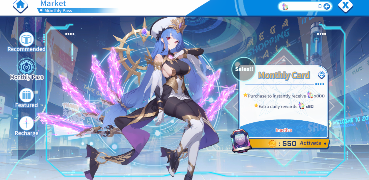 The Market (found on the left side) is the place where you can purchase in-game content, such as packs, bundles, luminite stones and the Monthly Pass. The Monthly Pass lasts for 30 days and gives you daily luminity stones.